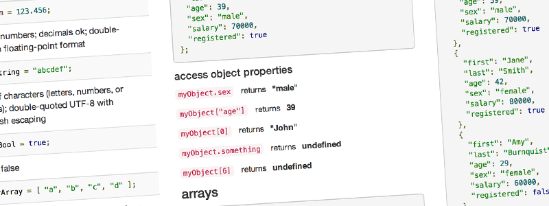 Get up to speed fast with the this excellent JSON cheat sheet. Never waste time searching for JSON references again.